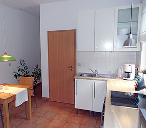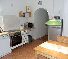 Ceranfeld mit Backofen, Mikrowelle, Kaffeemaschine, Wasserkocher, Toaster, Radio und allen wichtigen Küchenkleinteilen.